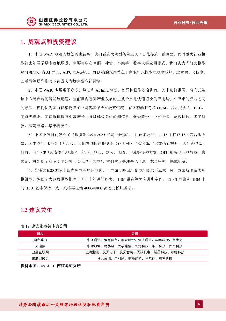 山西证券:通信周跟踪:WAIC2024千行百业AI落地加速,国内算力投资确定性加强.pdf