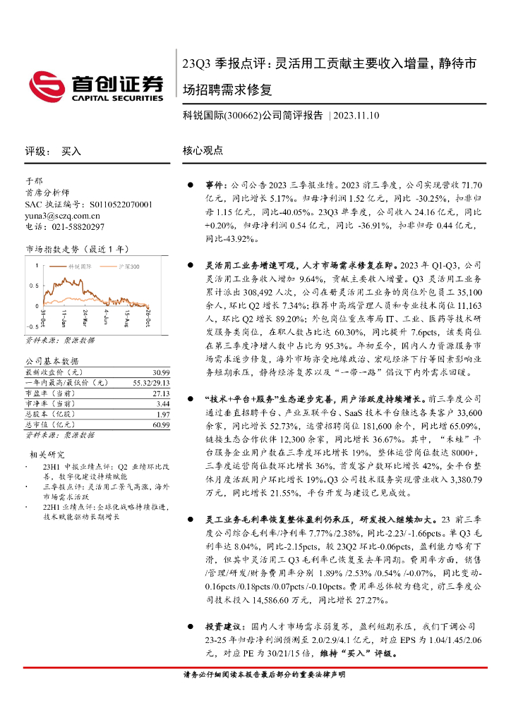 首创证券:科锐国际(300662)-23Q3季报点评:灵活用工贡献主要收入增量,静待市场招聘需求修复.pdf