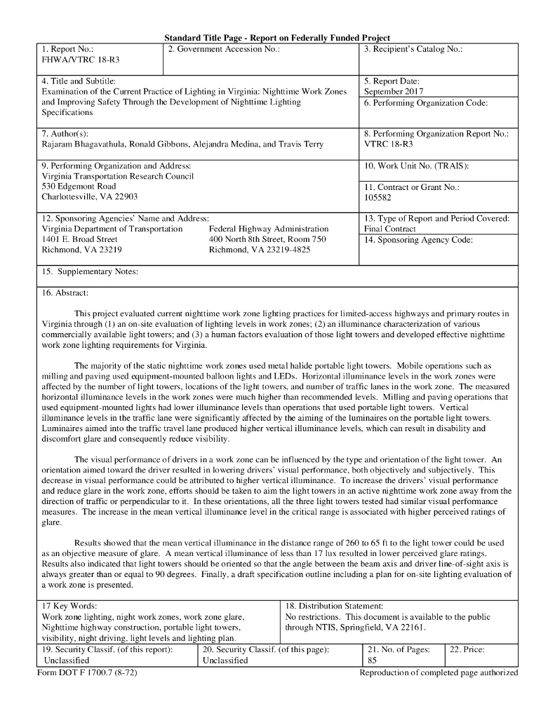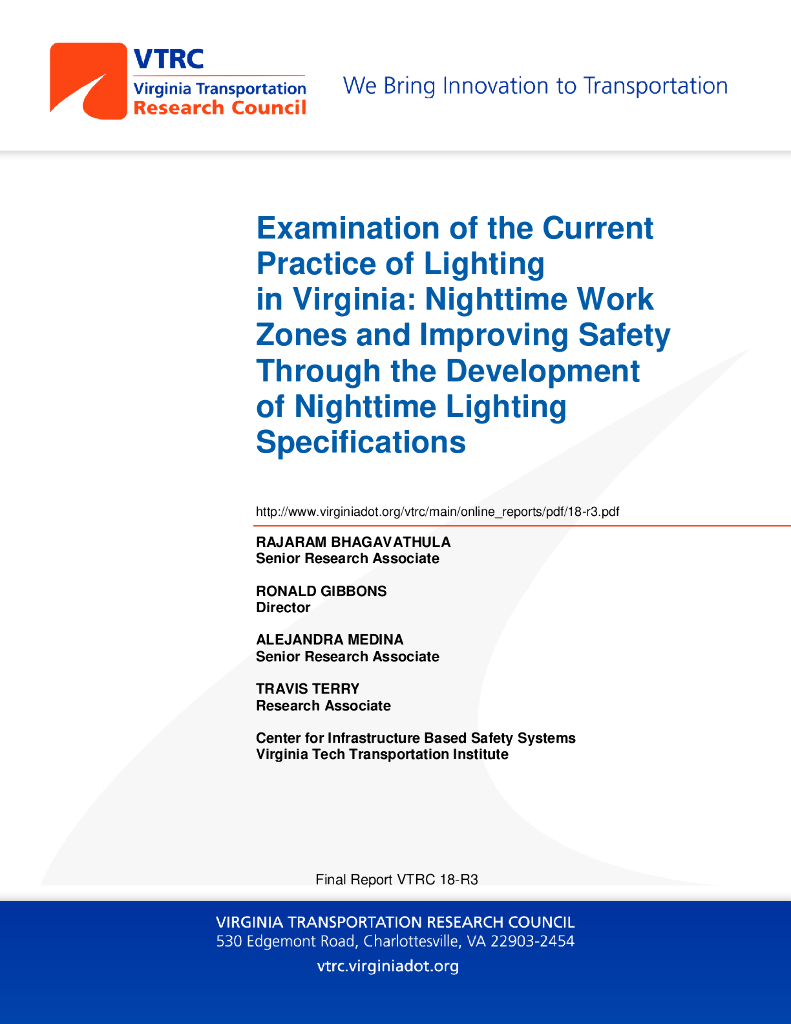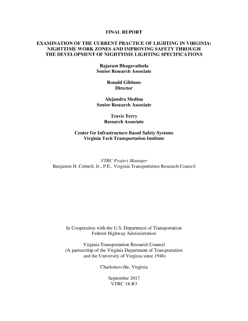 VTTI:2017年检查弗吉尼亚州当前的照明实​​践:夜间工作区并通过制定夜间照明规范提高安全性报告(英文版).pdf