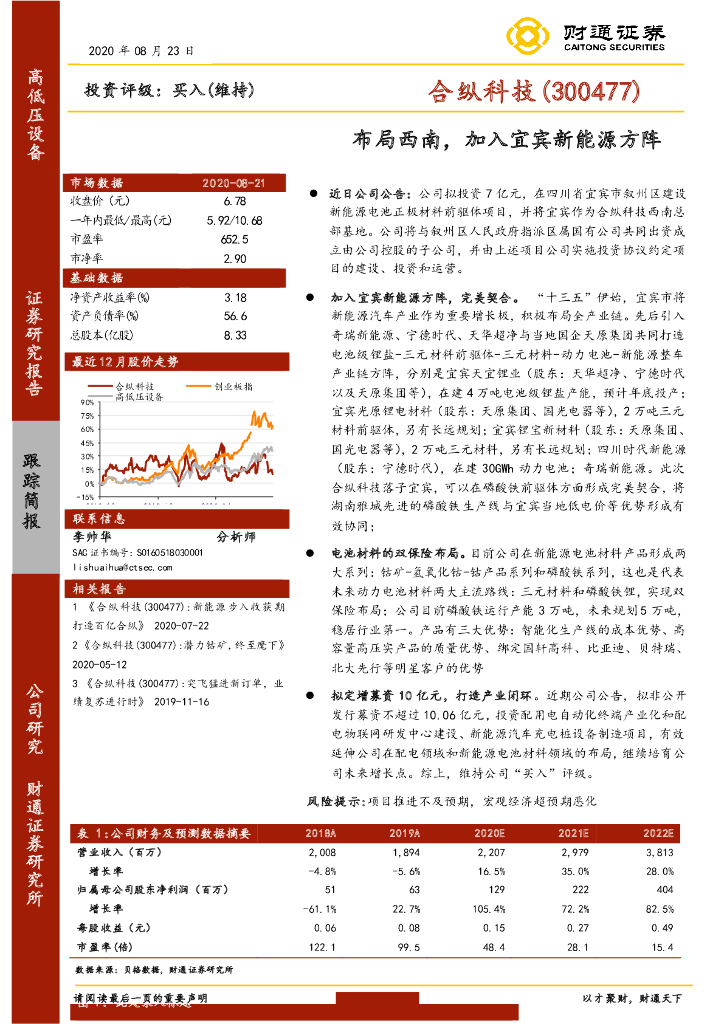 财通证券:合纵科技(300477)-布局西南,加入宜宾新能源方阵.pdf