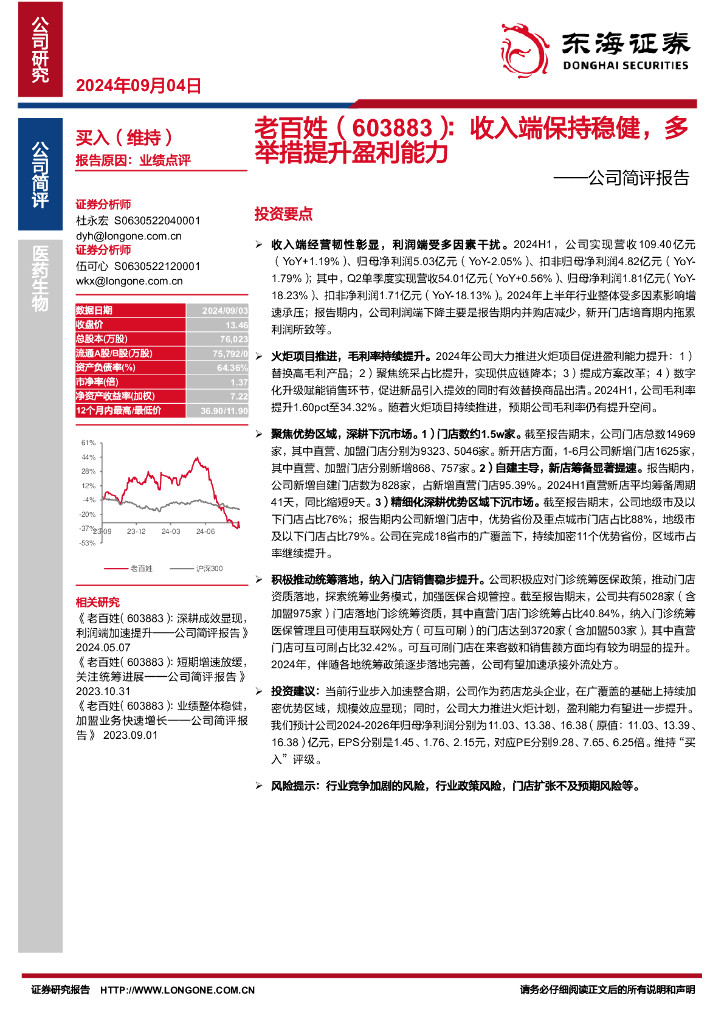 东海证券:老百姓(603883)-公司简评报告:收入端保持稳健,多举措提升盈利能力.pdf