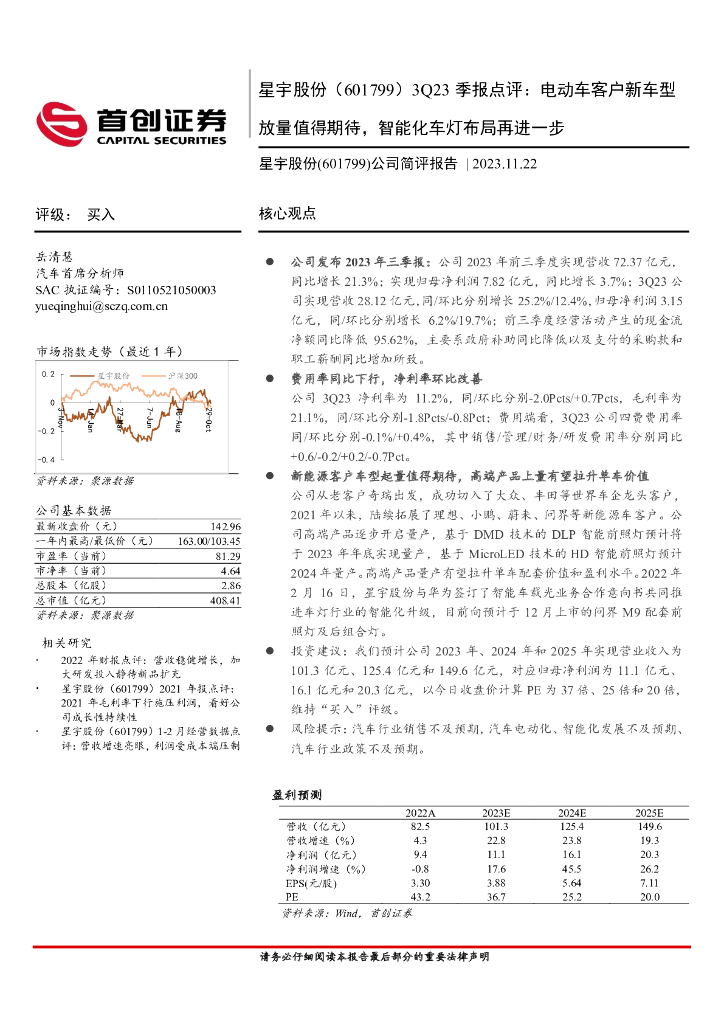 首创证券:星宇股份(601799)-3Q23季报点评:电动车客户新车型放量值得期待,智能化车灯布局再进一步.pdf