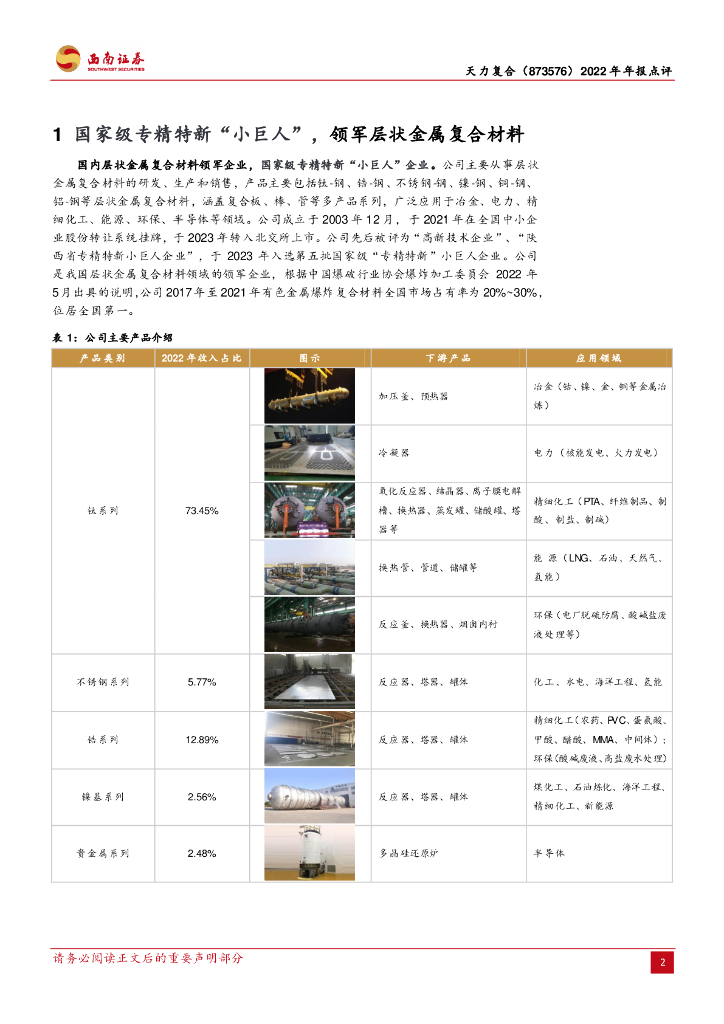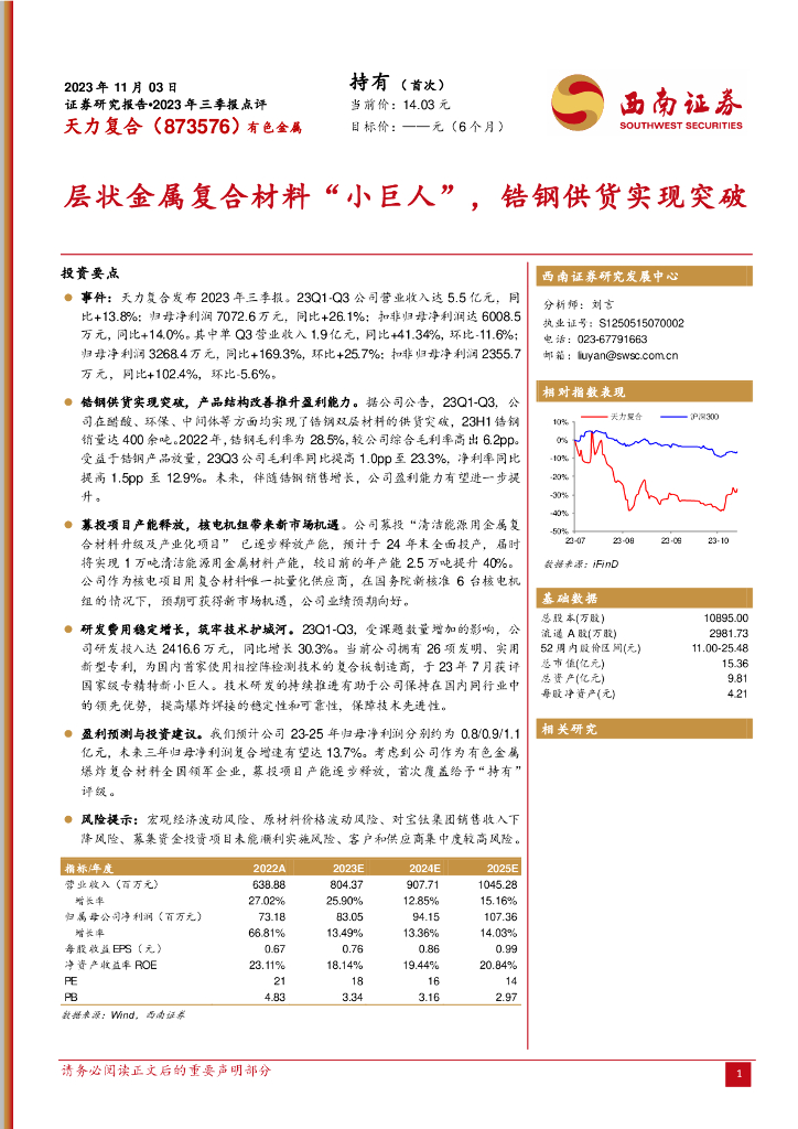 西南证券:天力复合(873576)-2023年三季报点评:层状金属复合材料“小巨人”,锆钢供货实现突破.pdf
