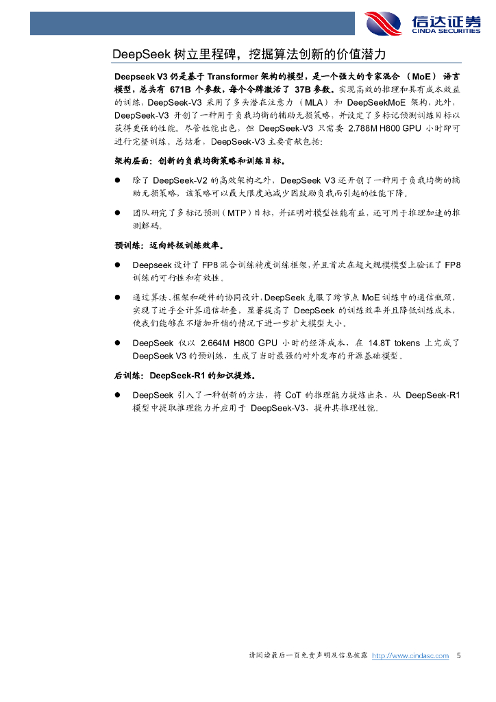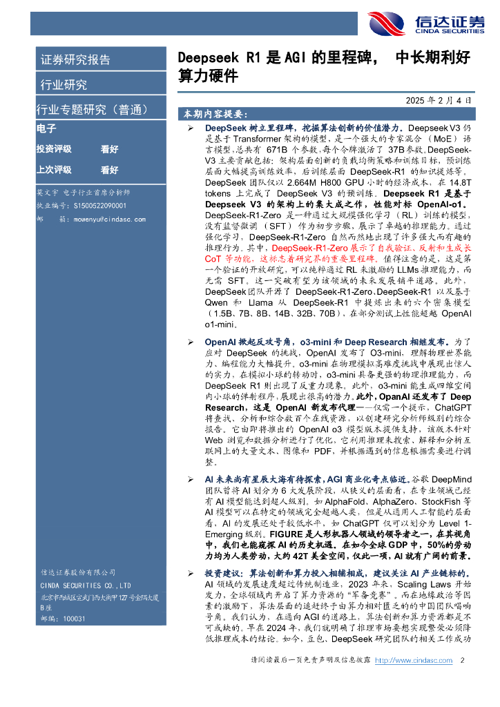 信达证券:电子行业专题研究(普通):DeepseekR1是AGI的里程碑,中长期利好算力硬件.pdf