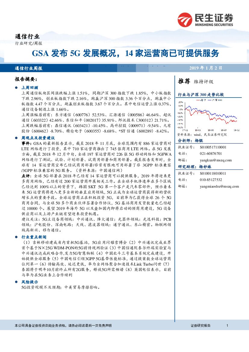 民生证券:通信行业周报:GSA发布5G发展概况,14家运营商已可提供服务.pdf