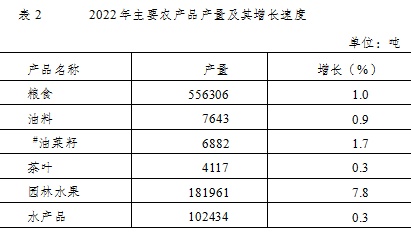 全年粮食总产量55.63万吨,比上年增长1.0%。油料总产量7643吨,比上年增长0.9%,其中油菜籽6882吨,比上年增长1.7%。茶叶总产量4117吨,比上年增长0.3%。园林水果总产量18.20万吨,比上年增长7.8%。