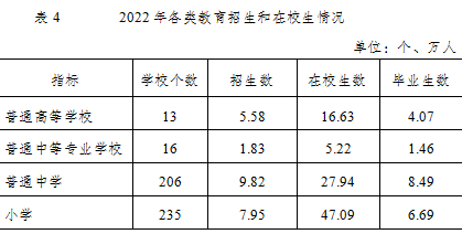 全市共有普通高校13所。普通高等教育本专科招生5.16万人,在校生15.41万人,毕业生3.80万人;研究生教育招生0.42万人,在校生1.22万人,毕业生0.27万人。全市中等职业教育在校生5.22万人。九年义务教育巩固率100%,高中阶段教育毛入学率99.5%,普及高中阶段教育。特殊教育招生366人,在校生1584人。全市共有幼儿园596所,比上年增加16所,在园幼儿21.72万人,比上年增加0.34万人。