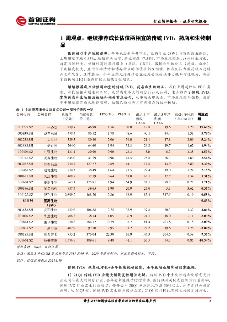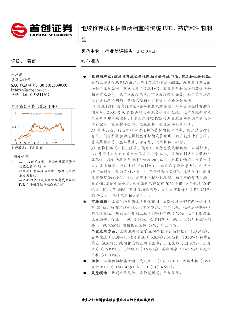 首创证券:医药生物行业简评报告:继续推荐成长估值两相宜的传统IVD、药店和生物制品.pdf