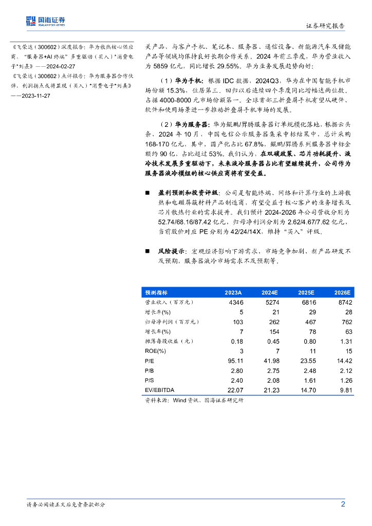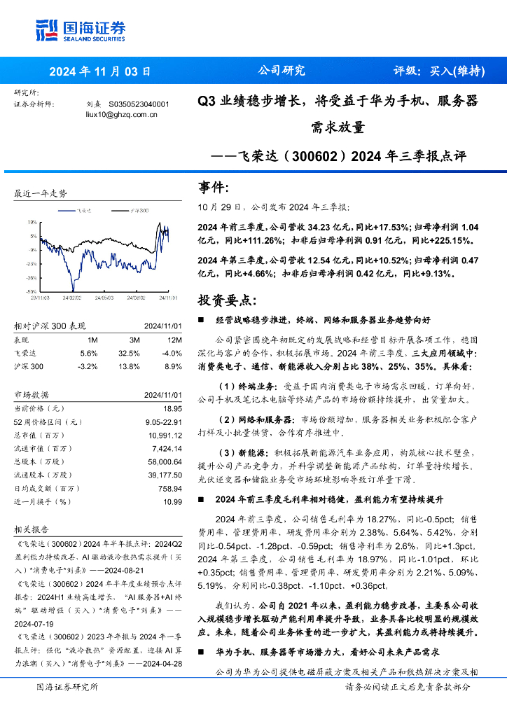 国海证券:飞荣达(300602)-2024年三季报点评:Q3业绩稳步增长,将受益于华为手机、服务器需求放量.pdf