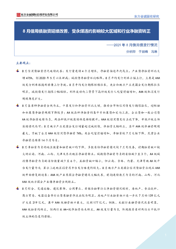 东方金诚:8月信用债融资延续改善,受永煤违约影响较大区域和行业净融资转正-2021年8月信用债发行情况.pdf