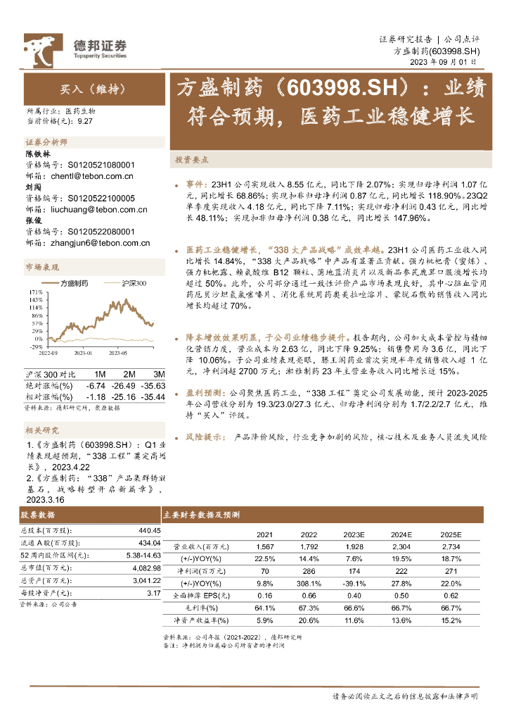 德邦证券:方盛制药(603998)-业绩符合预期,医药工业稳健增长.pdf