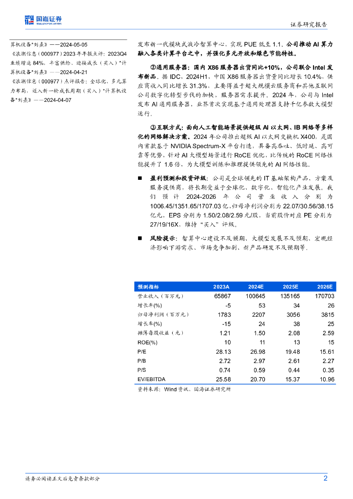 国海证券:浪潮信息(000977)-2024年三季度业绩预告点评:Q3业绩持续高增,“AI+通用+联接”三维发力.pdf