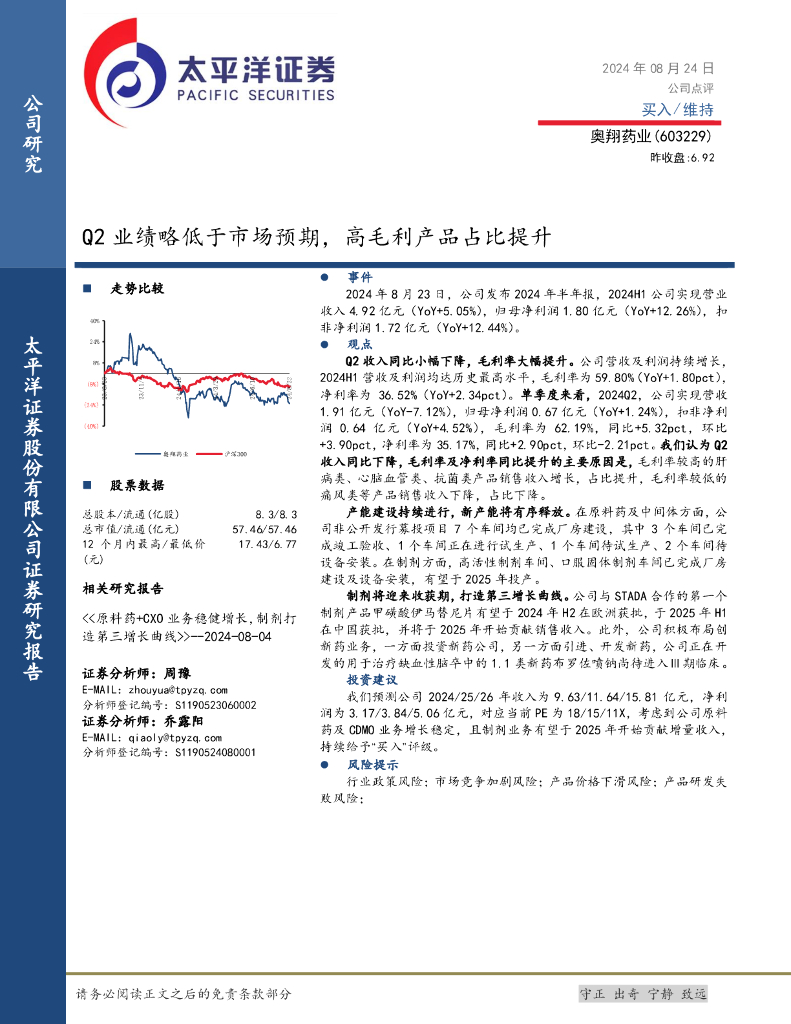 太平洋证券:奥翔药业(603229)-Q2业绩略低于市场预期,高毛利产品占比提升.pdf