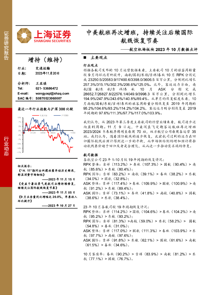 上海证券:航空机场板块2023年10月数据点评:中美航班再次增班,持续关注后续国际航线恢复节奏.pdf