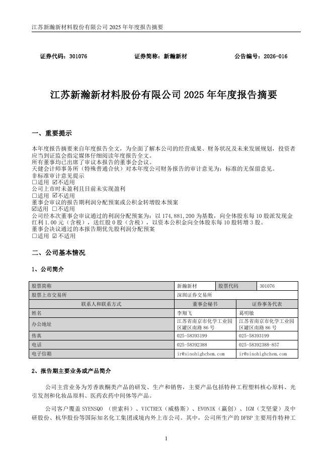 301076-新瀚新材:2025年年度报告摘要.pdf