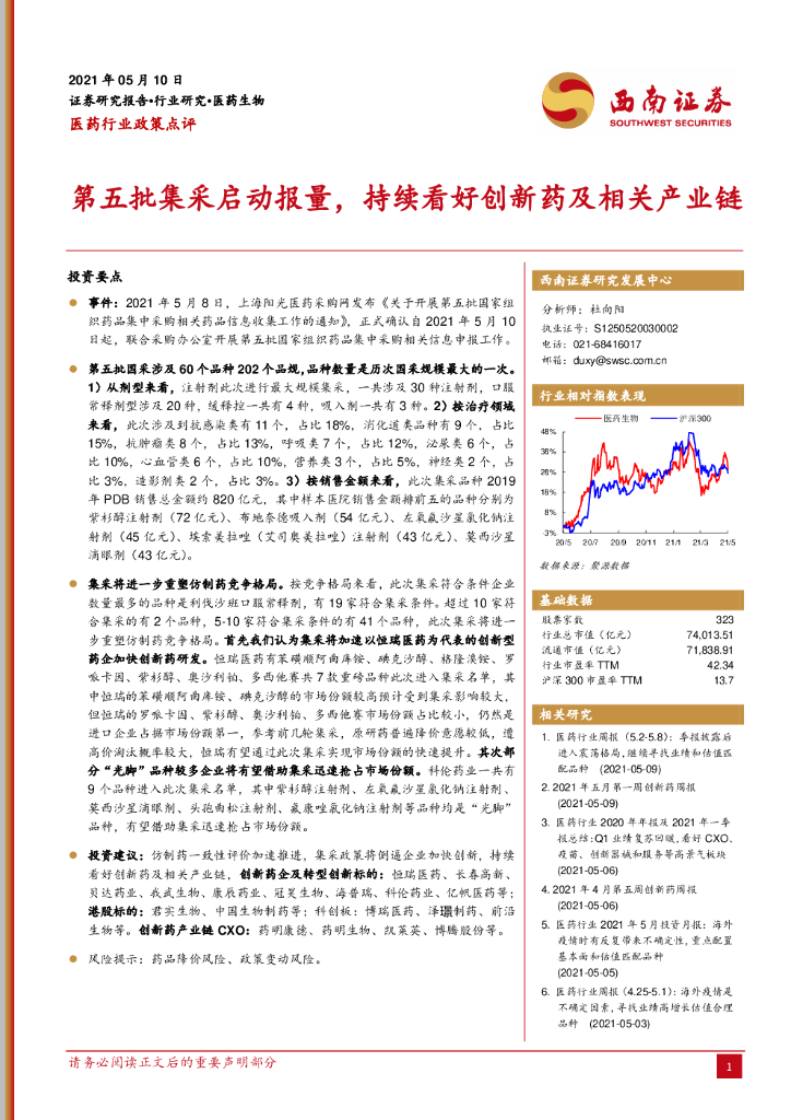 西南证券:医药行业政策点评:第五批集采启动报量,持续看好创新药及相关产业链.pdf