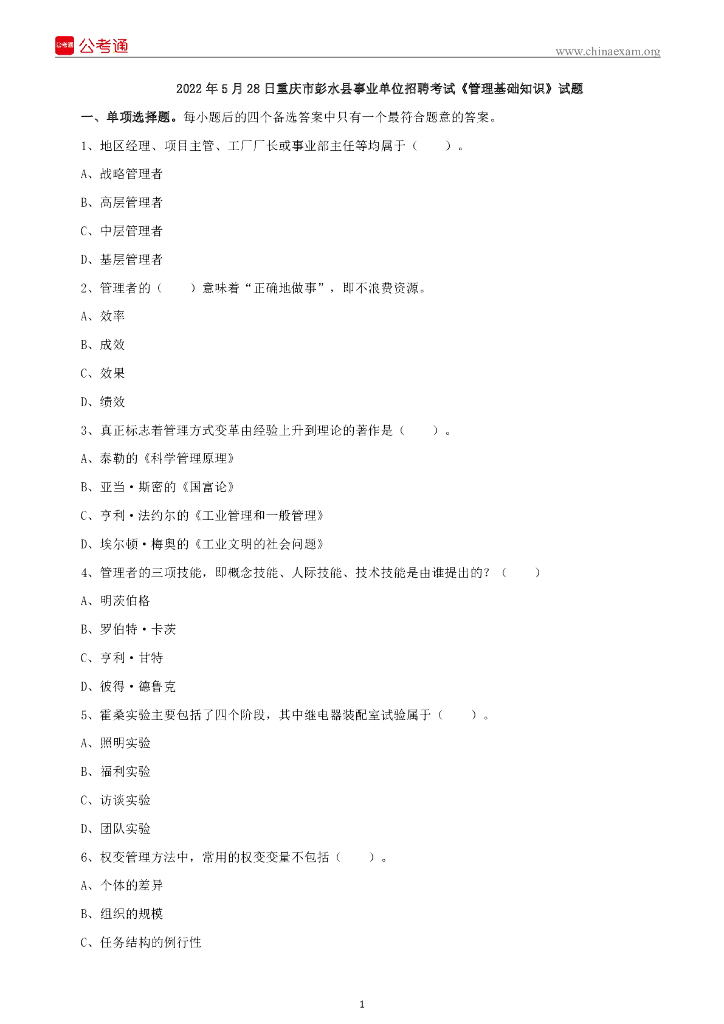 2022年5月28日重庆市彭水县事业单位招聘考试《管理基础知识》试题.pdf