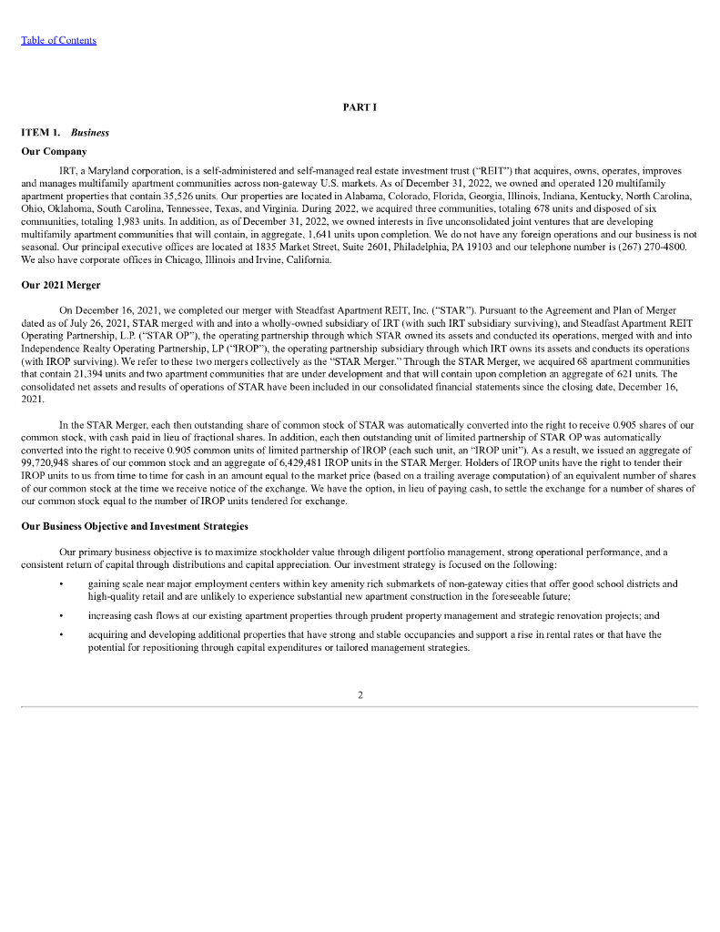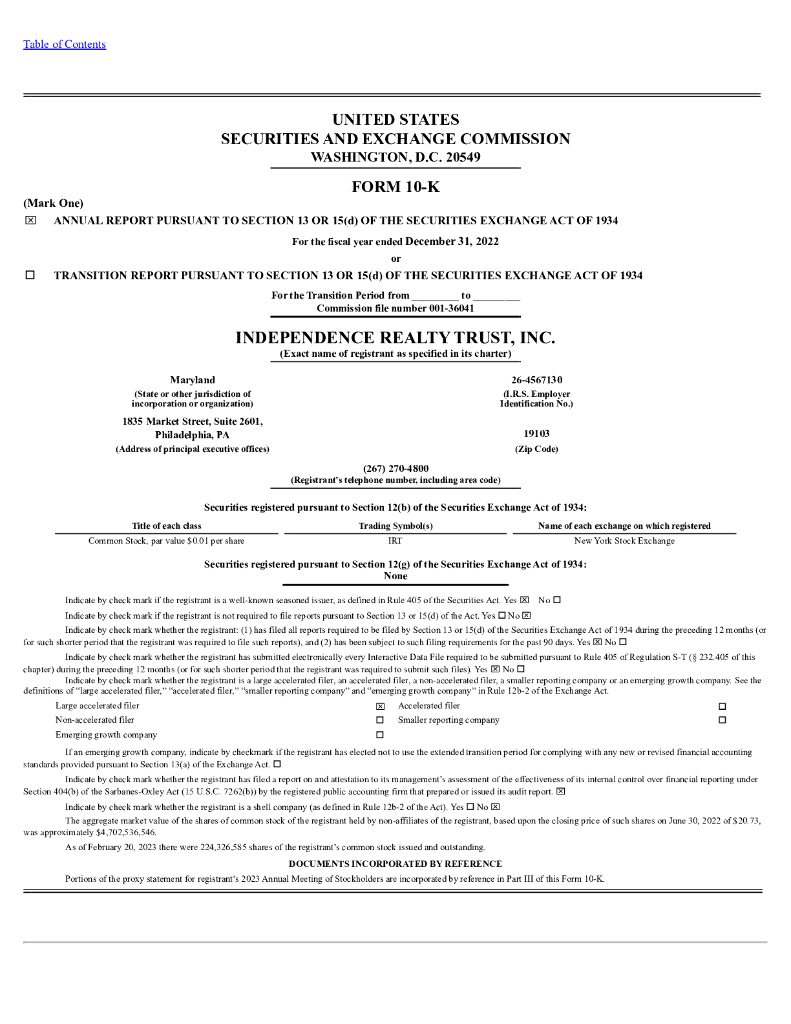 Independence Realty Trust Inc(IRT)2022财年年度报告(英文版).pdf