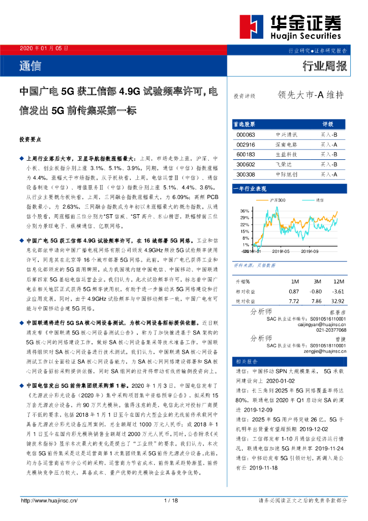 华金证券:通信行业周报:中国广电5G获工信部4.9G试验频率许可,电信发出5G前传集采第一标.pdf