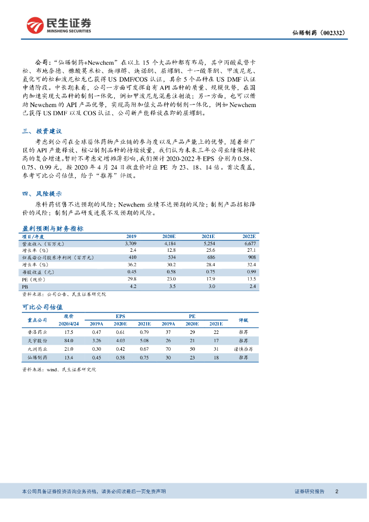民生证券:仙琚制药2020年一季报点评:Q1主业同比增长近100%,API产能释放全年高增长可期.pdf