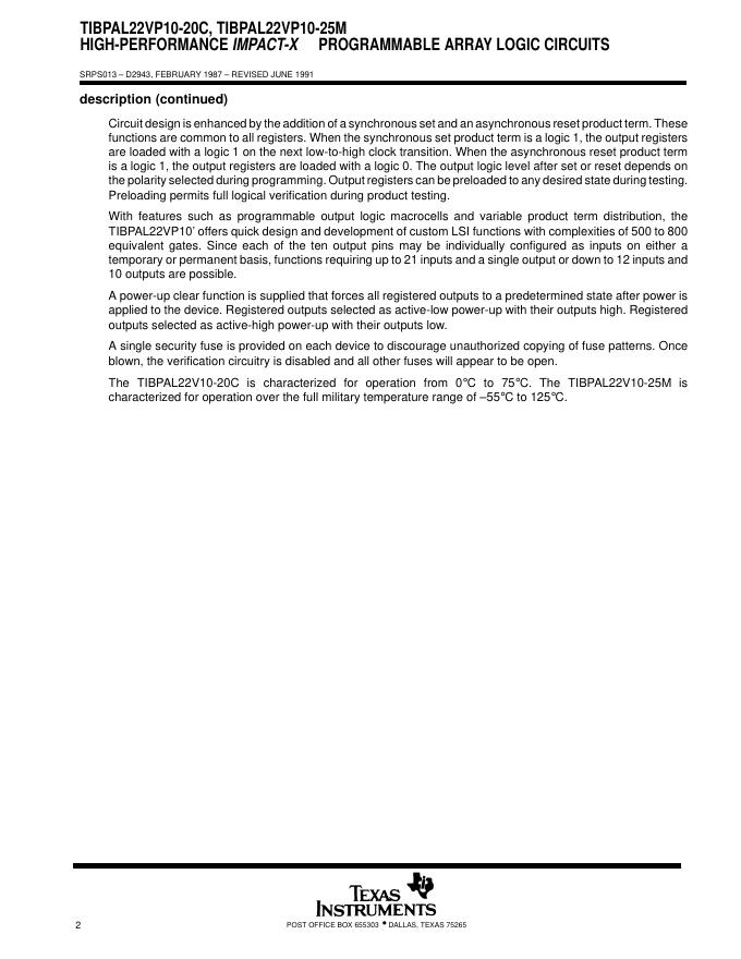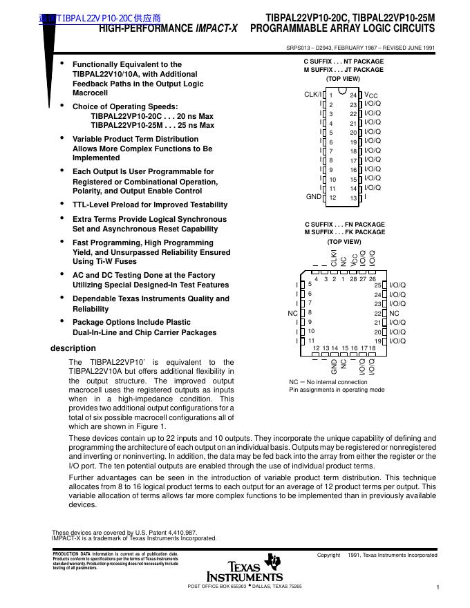 TEXAS INSTRUMENTS TIBPAL22VP10-20C, TIBPAL22VP10-25M HIGH-PERFORMANCE IMPACT-X  PROGRAMMABLE ARRAY LOGIC CIRCUITS 数据手册.pdf