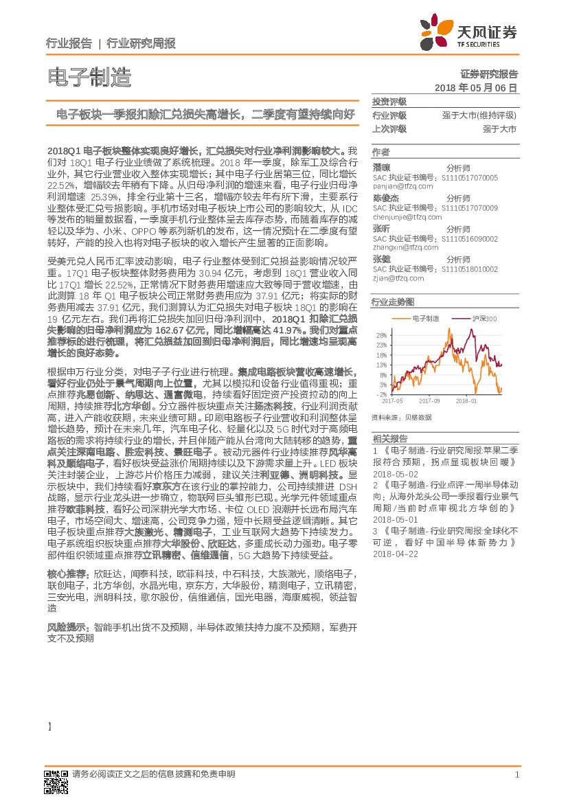 天风证券:电子制造行业研究周报:电子板块一季报扣除汇兑损失高增长,二季度有望持续向好.pdf