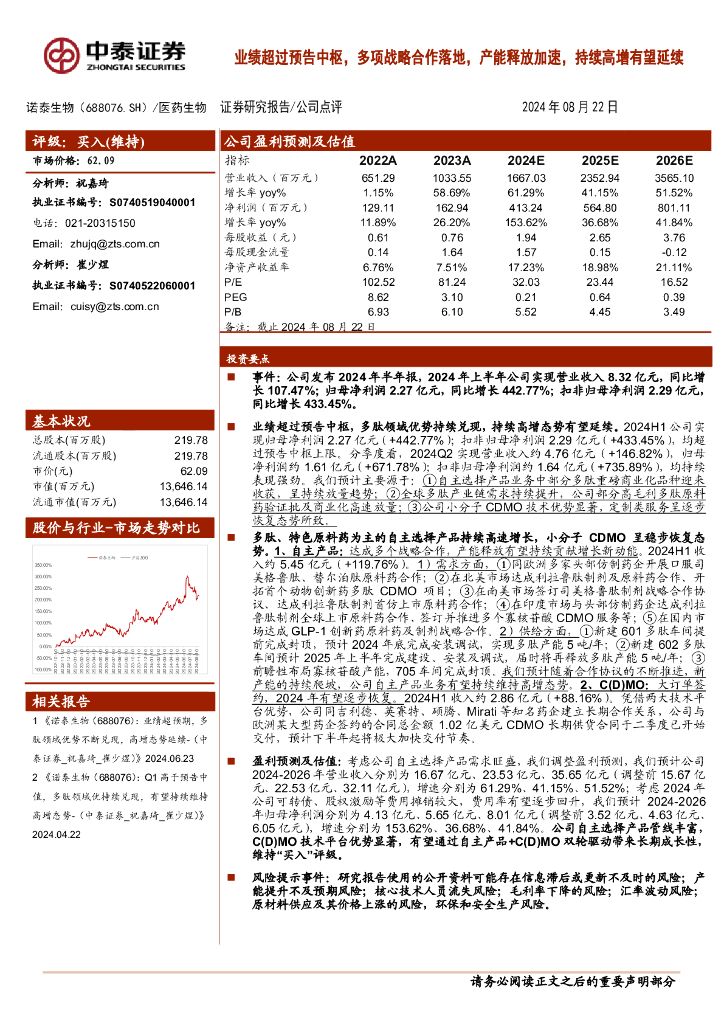 中泰证券:诺泰生物(688076)-业绩超过预告中枢,多项战略合作落地,产能释放加速,持续高增有望延续.pdf