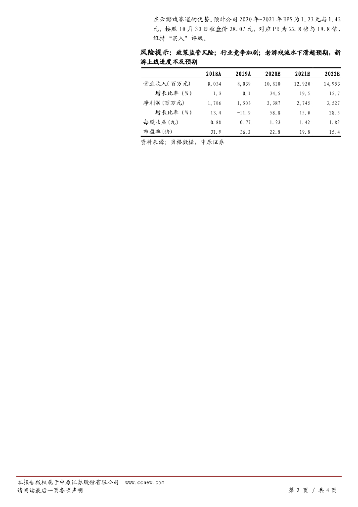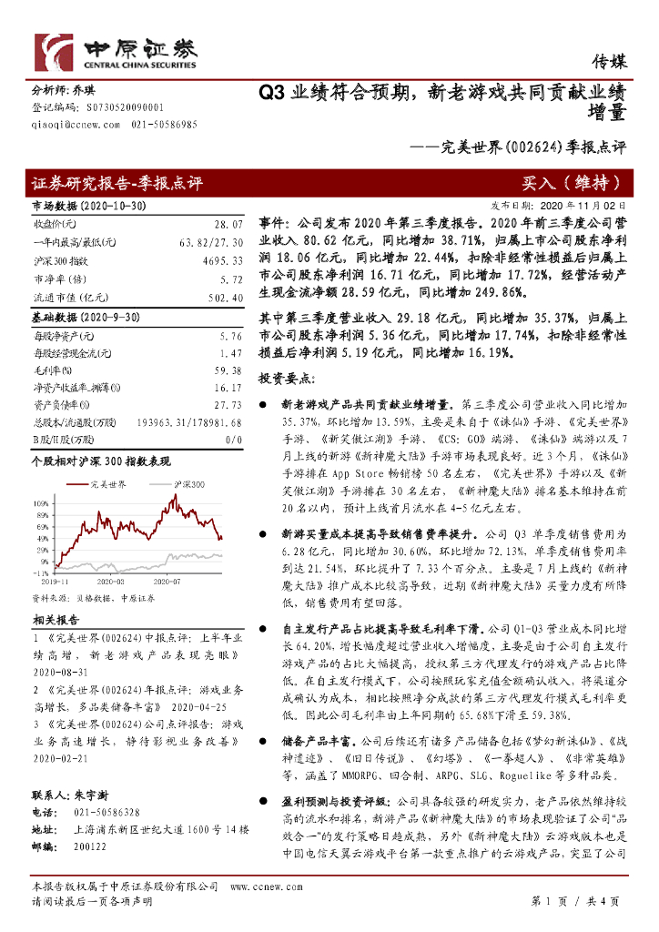中原证券:完美世界(002624)-季报点评:Q3业绩符合预期,新老游戏共同贡献业绩增量.pdf