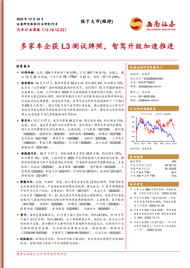 西南证券:汽车行业周报:多家车企获L3测试牌照,智驾升级加速推进.pdf
