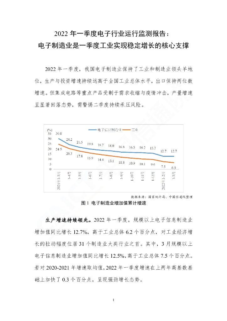 中国信通院:2022年一季度电子行业运行监测报告:电子制造业是一季度工业实现稳定增长的核心支撑.pdf