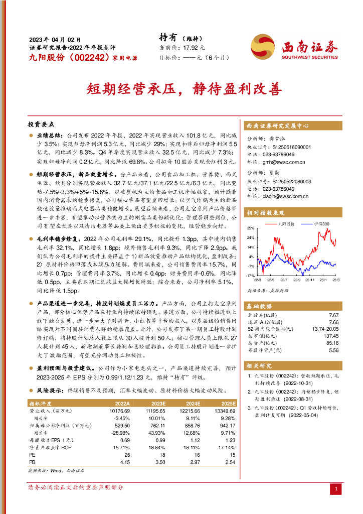 西南证券:九阳股份(002242)-短期经营承压,静待盈利改善.pdf