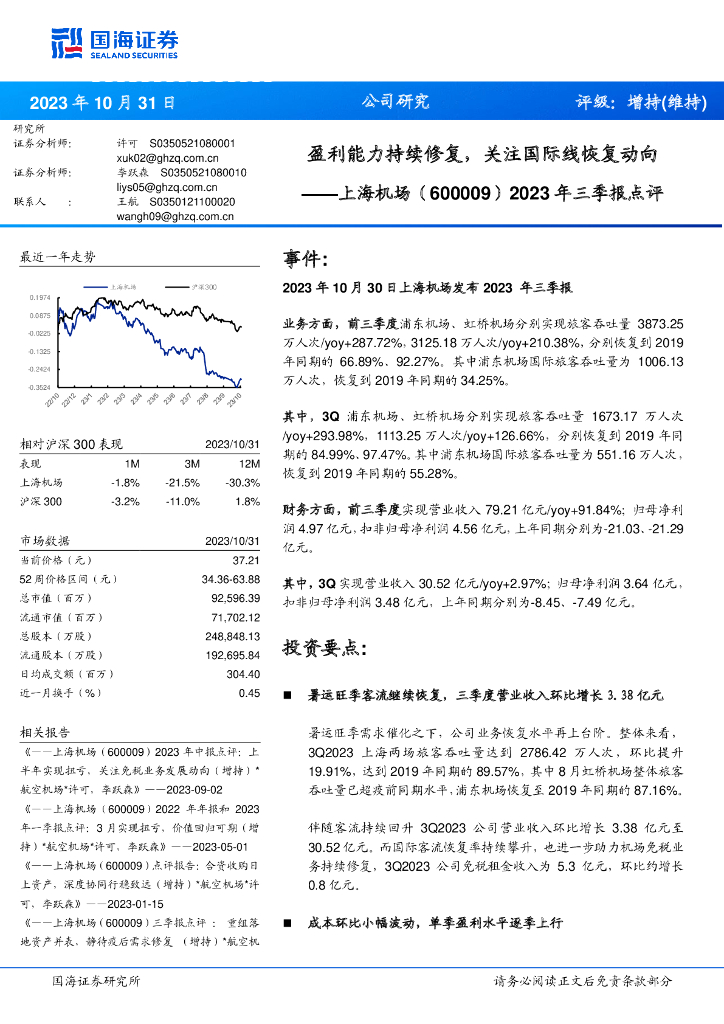 国海证券:上海机场(600009)-2023年三季报点评:盈利能力持续修复,关注国际线恢复动向.pdf