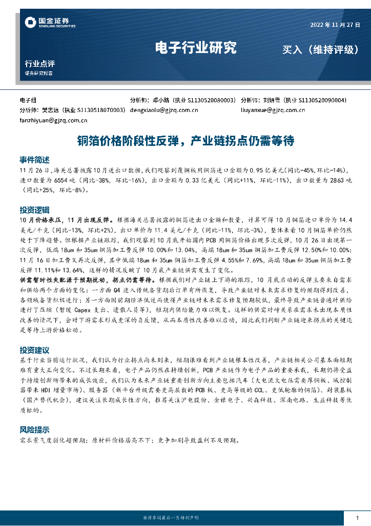 国金证券:电子行业研究:铜箔价格阶段性反弹,产业链拐点仍需等待.pdf