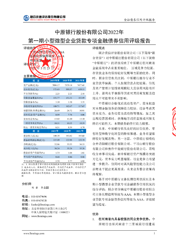 联合资信:中原银行股份有限公司2022年第一期小型微型企业贷款专项金融债券信用评级报告.pdf