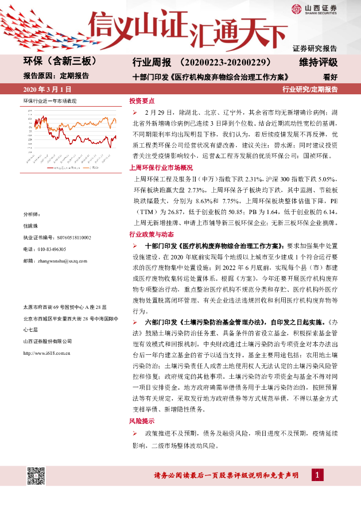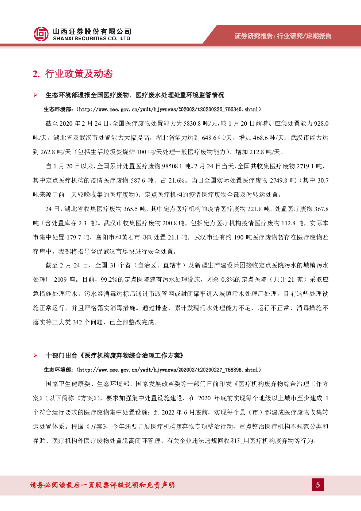山西证券:环保(含新三板)行业周报:十部门印发《医疗机构废弃物综合治理工作方案》.pdf