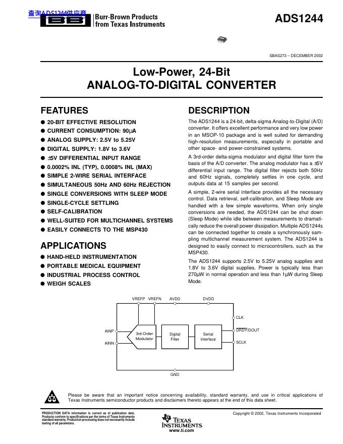 TEXAS INSTRUMENTS ADS1244 Low-Power, 24-Bit ANALOG-TO-DIGITAL CONVERTER 数据手册.pdf