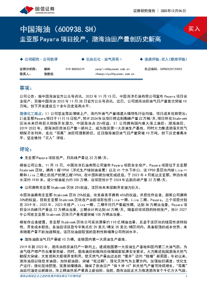 国信证券:中国海油(600938)-圭亚那Payara项目投产,渤海油田产量创历史新高.pdf