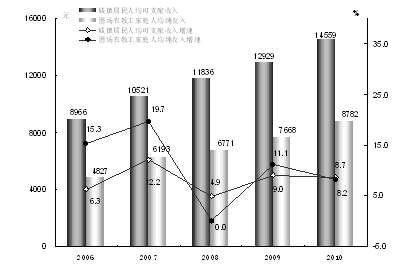 图9 2006-2010年城镇、团场居民收入及其增长速度