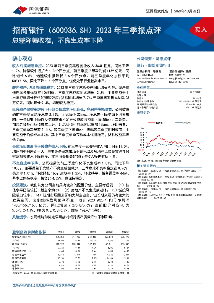 国信证券:招商银行(600036)-2023年三季报点评:息差降幅收窄,不良生成率下降.pdf