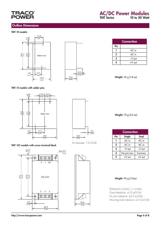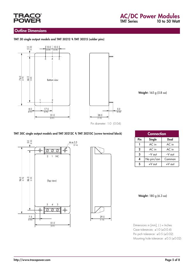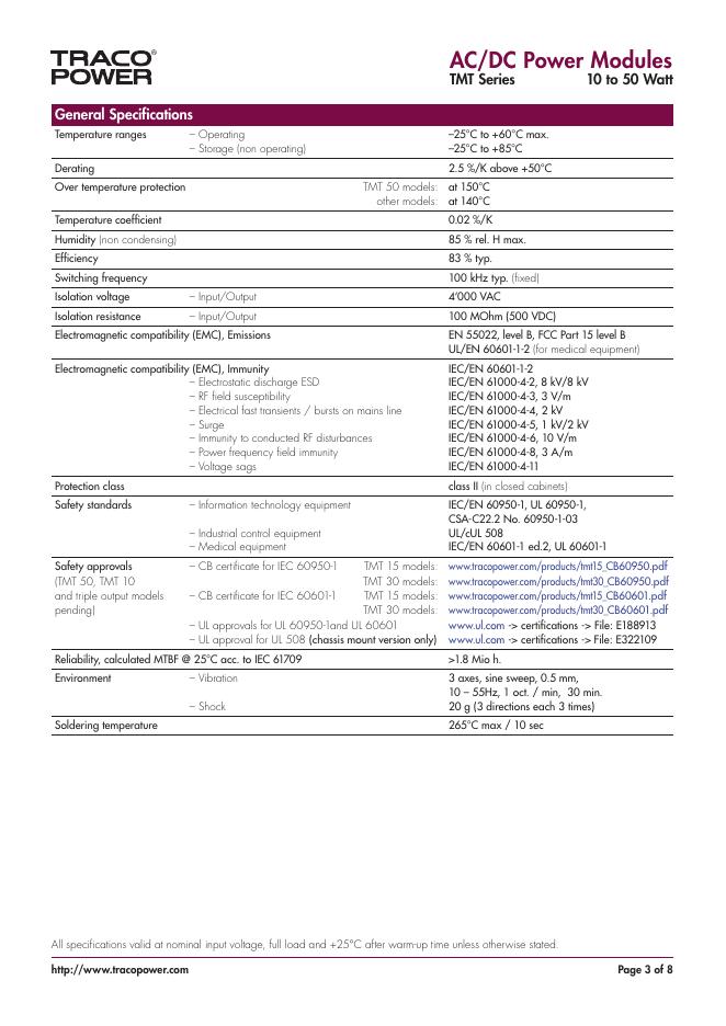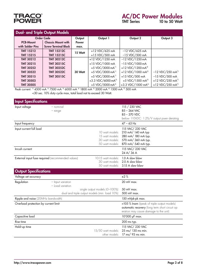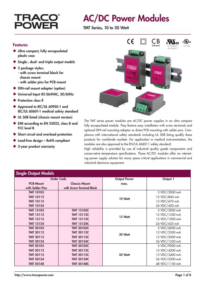 TRACOPOWER AC/DC Power Modules TMT Series, 10 to 50 Watt 数据手册.pdf
