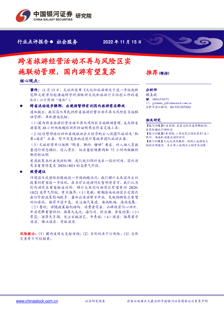 中国银河:社会服务行业点评报告:跨省旅游经营活动不再与风险区实施联动管理,国内游有望复苏.pdf