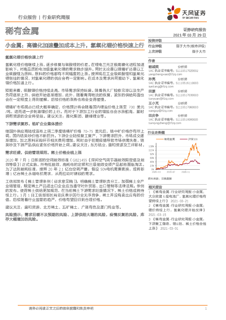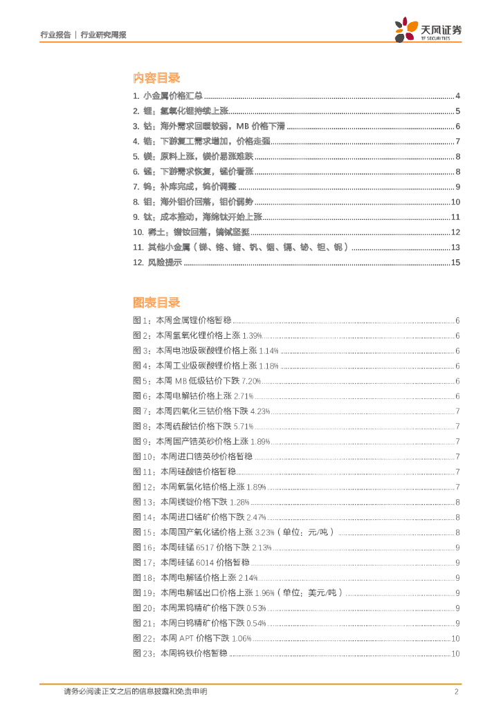 天风证券:稀有金属行业研究周报:小金属:高镍化加速叠加成本上升,氢氧化锂价格快速上行.pdf