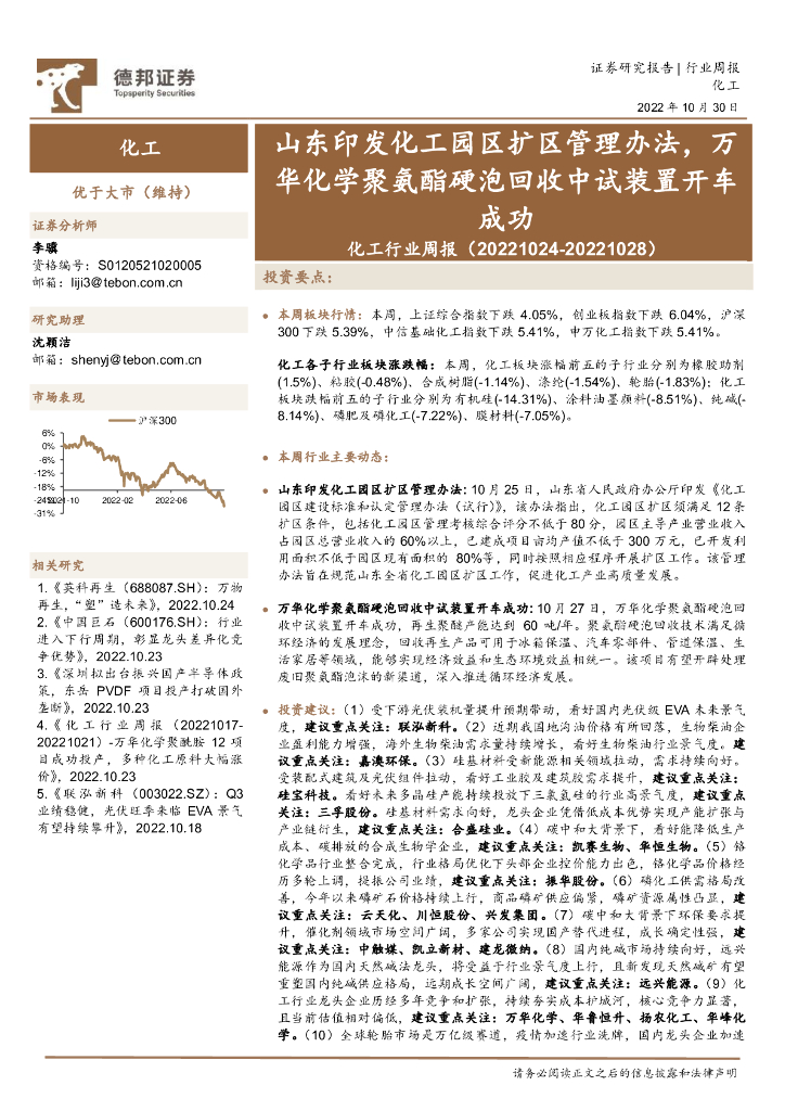 德邦证券:化工行业周报:山东印发化工园区扩区管理办法,万华化学聚氨酯硬泡回收中试装置开车成功.pdf