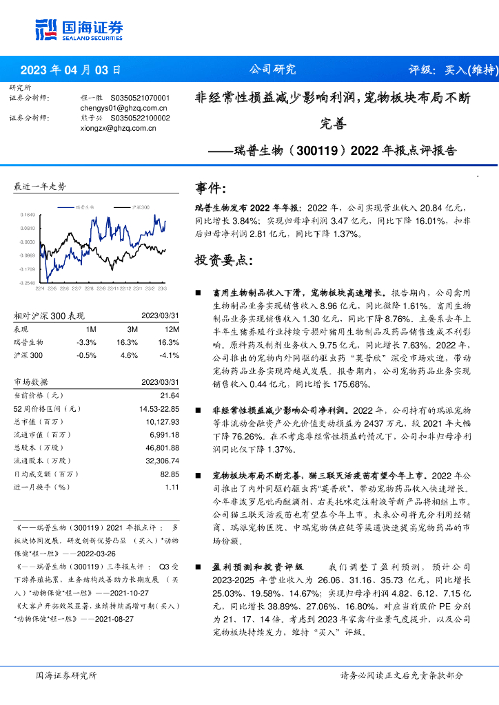 国海证券:瑞普生物(300119)-2022年报点评报告:非经常性损益减少影响利润,宠物板块布局不断完善.pdf