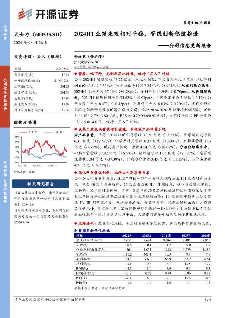 开源证券:天士力(600535)-公司信息更新报告:2024H1业绩表现相对平稳,管线创新稳健推进.pdf