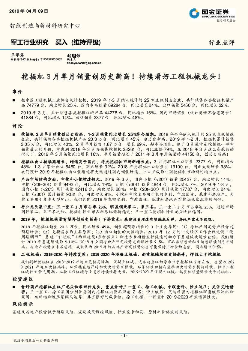 国金证券:军工行业点评:挖掘机3月单月销量创历史新高!持续看好工程机械龙头!.pdf