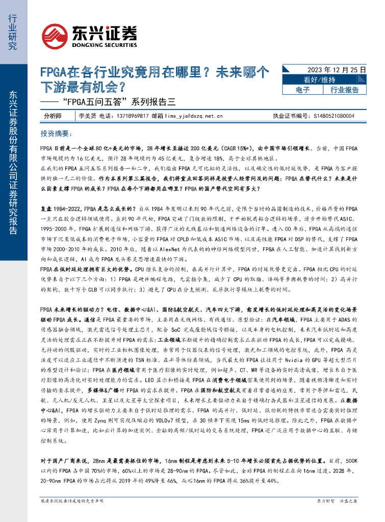 东兴证券:电子:“FPGA五问五答”系列报告三-FPGA在各行业究竟用在哪里?未来哪个下游最有机会?.pdf