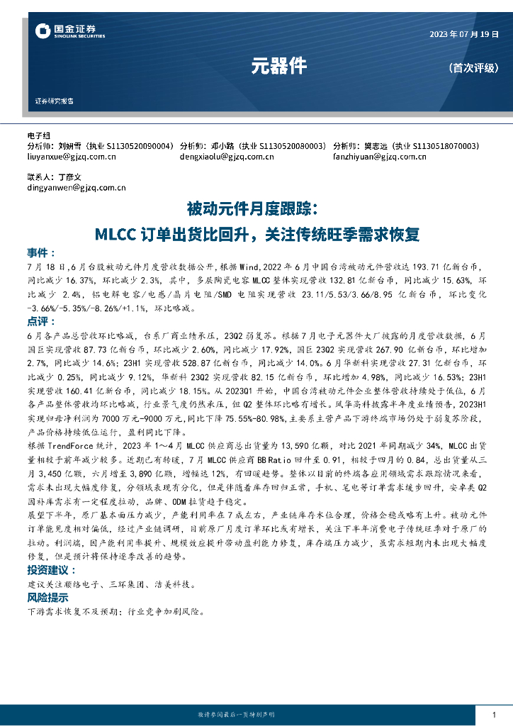 国金证券:被动元件月度跟踪:MLCC订单出货比回升,关注传统旺季需求恢复.pdf