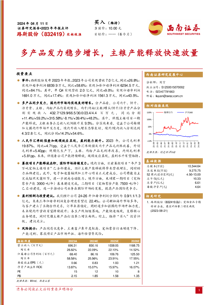 西南证券:路斯股份(832419)-多产品发力稳步增长,主粮产能释放快速放量.pdf