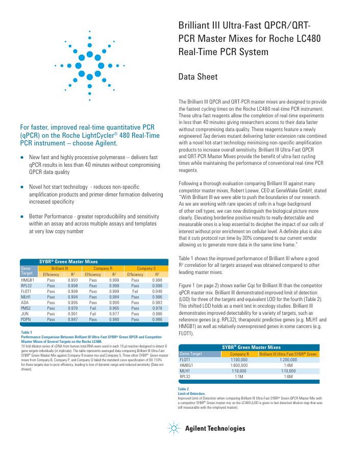 Agilent Brilliant III Ultra-Fast QPCR/QRT-PCR Master Mixes for Roche LC480 Real-Time PCR System 数据手册(1).pdf